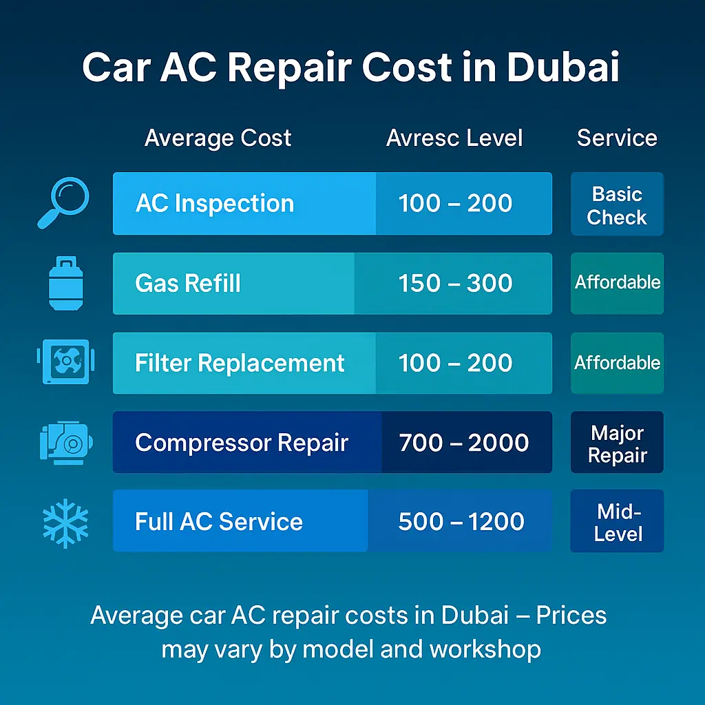 The cost of ac repair dubai varies depending on your car model, the type of service, and the workshop location. Below is an average cost breakdown.